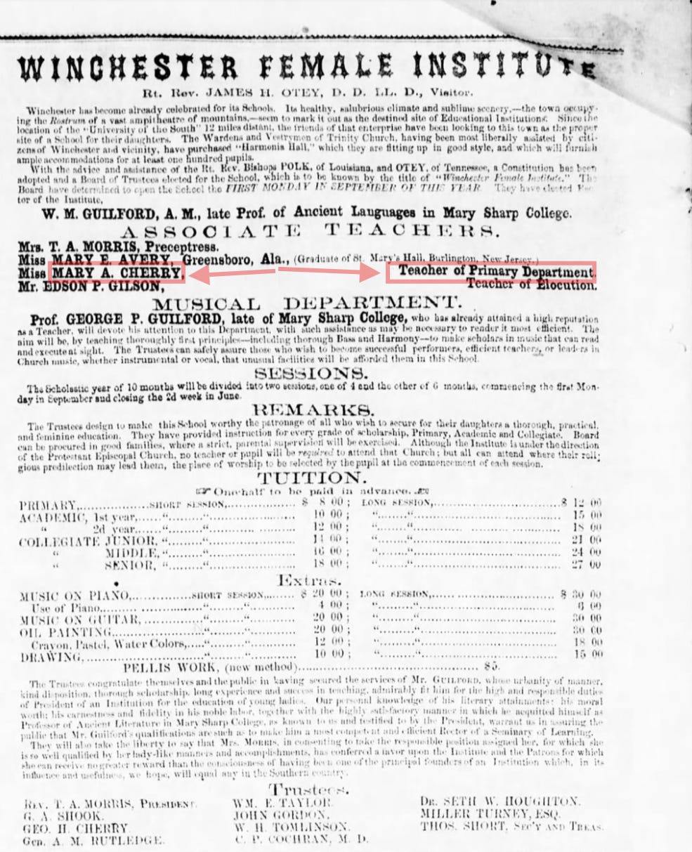 My maternal great aunt (3x), Miss Mary Cherry, began teaching elementary students in September 1860 at the newly founded ‘Winchester Female Institute’ in Winchester, Tennessee.